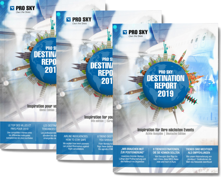 Dans son enquête annuelle, Pro Sky interroge les organisateurs MICE pour la neuvième édition du PRO SKY Destination Report. Tous les organisateurs d'événements en rapport à l'industrie MICE (Meetings, Incentives, Conferences and Events) sont invités à participer à l'enquête, à partager leurs connaissances d’expert et à ainsi faire entendre leur opinion. En collaboration avec des professionnels de l'événementiel, nous déterminons les destinations tendance d’aujourd'hui ainsi que les principaux paramètres pris en compte lors de l’organisation d'événements. Nous publierons les résultats de l'enquête début 2020 dans le PRO SKY Destination Report 2020 qui pourra être téléchargé gratuitement.